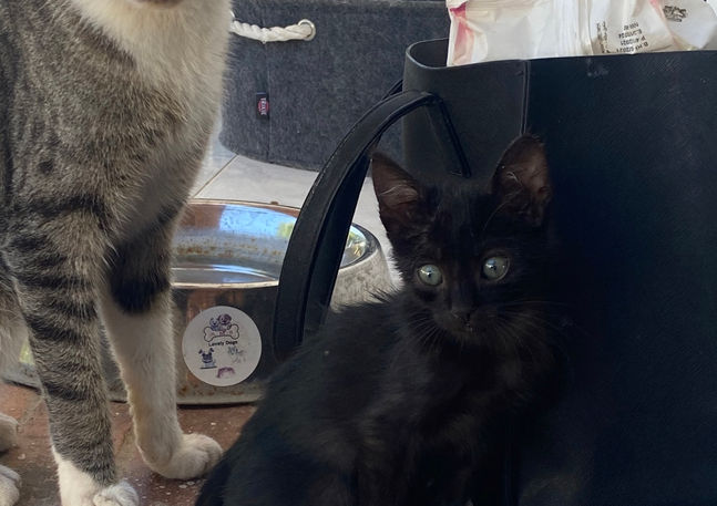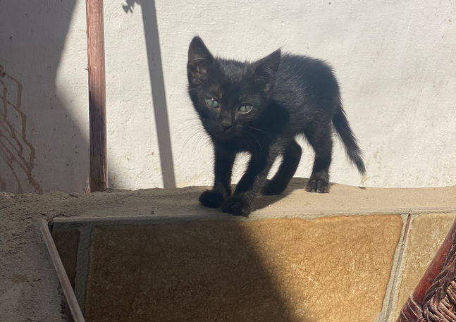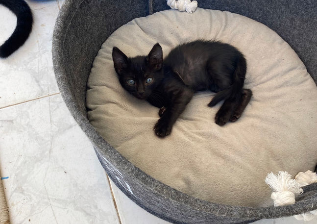 Spoon really came out of nowhere. We think someone threw him over the fence. We estimate him at 3/4 weeks. He is comfortable, well fed & loved now.